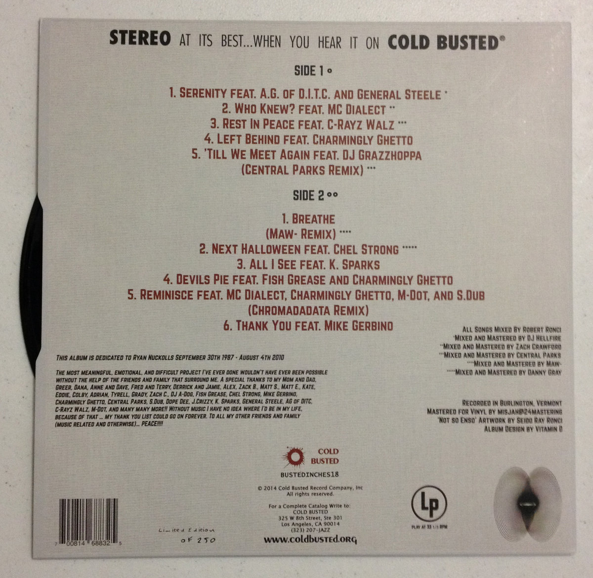 This album is dedicated to Ryan Nuckolls September 30th 1987 - August 4th 2010 The most meaningful, emotional, and difficult project I’ve ever done wouldn’t have ever been possible without the help of the friends and family that surround me. A special thanks to my Mom and Dad, Greer, Dana, Anne and Dave, Fred and Terry, Derrick and Jamie, Alex, Zack B., Matt S., Matt E., Kate, Justin, Eddie, Colby, Adrian, Tyrell, Grady, Zach C., DJ A-Dog, Fish Grease, Chel Strong, Mike Gerbino, Charmingly Ghetto, Central Parks, S.Dub, Dope Dee, J.Crizzy, K. Sparks, General Steele, AG of DITC, C-Rayz Walz, M-Dot, and many many more!! Without music I have no idea where I’d be in my life, because of that … my thank you list could go on forever. To all my other friends and family (music related and otherwise)… PEACE!!!!
